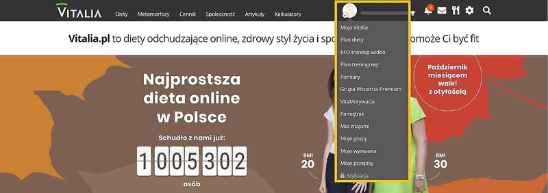 - ↑na strzałkę przy awatarze, rozwinie się lista Waszych, osobistych planów diety, pomiarów, wyzwań czy znajomych.